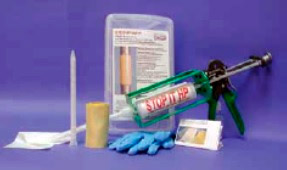 El Sistema de Reparación de Tubería STOP IT incluye una cinta resistente tejida de fibra de vidrio recubierta con resinas de uretano de rápida acción que se activan con agua. El sistema también incluye FIX STIX, una resina epoximoldeable a mano y rellena con acero que se pone dura como una roca en sólo 20 minutos. Es perfecta para arreglar fugas, rellenar rajaduras y huecos difíciles y derivaciones en las cuplas y accesorios.