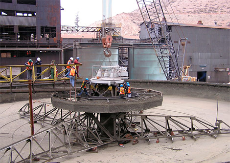 Tanque espesador de cobre de 140 pies de diametro con accionamiento mecánico, que estuvo operando por más de 50 años con problemas de tornillo sin fin, cadenas, rodamientos, etc. Lo cual fue reemplazado por un accionamiento moderno de mando hidráulico de alta disponibilidad y confibilidad de servicio